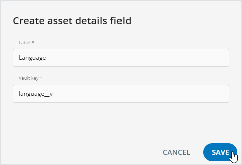Label: Enter the metadata field name to include in theAssetspopup.Vault key: Enter the metadata key from Veeva Vault PromoMats.Asset type: Select the target asset type to display the configured metadata field.