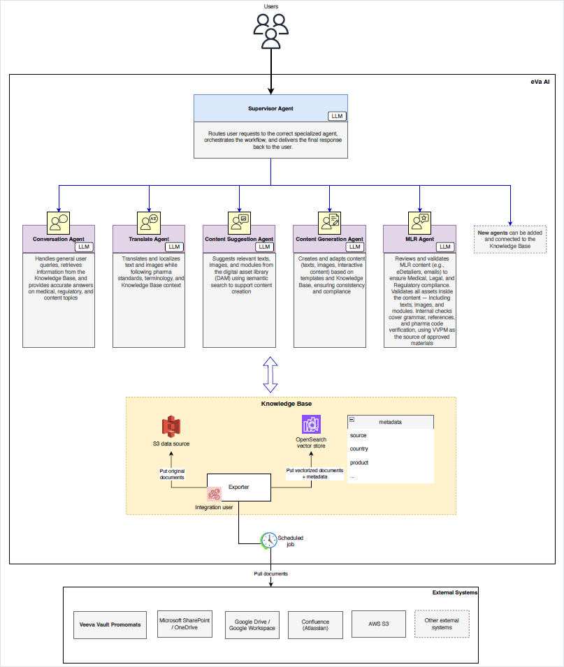 This multi-agent system follows a hierarchical approach with the Supervisor agent at its core, orchestrating five specialized agents that handle distinct operational domains. Each agent operates independently, leverages large language models (LLMs), and connects to your shared knowledge base. The eVa AI architecture is extensible and supports adding new agents and linking them to your knowledge base.