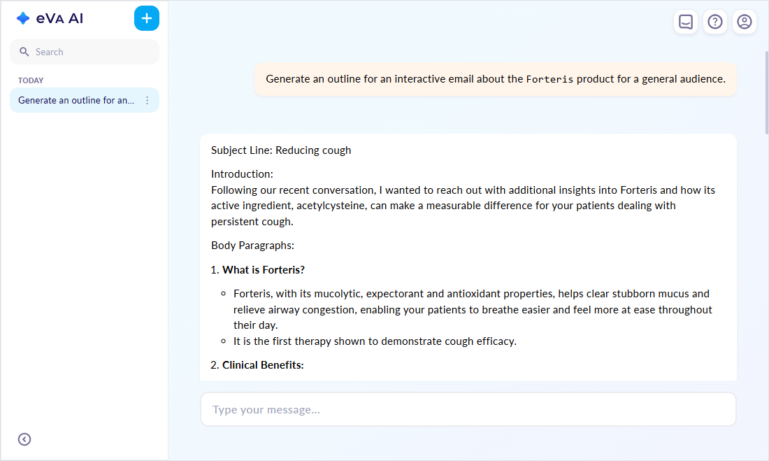 The eVa AI agent always uses the most recent outline from the chat to generate the interactive email.