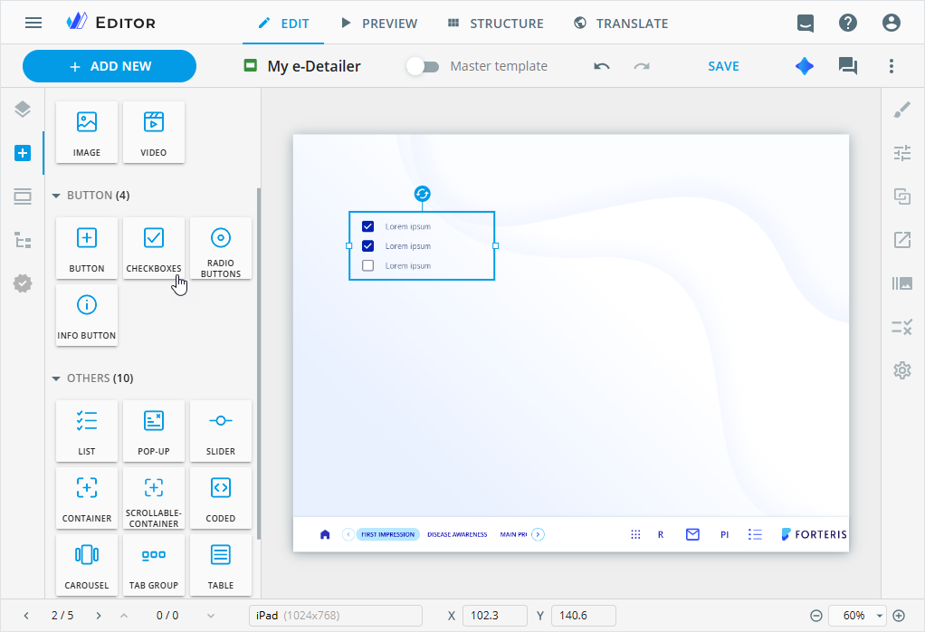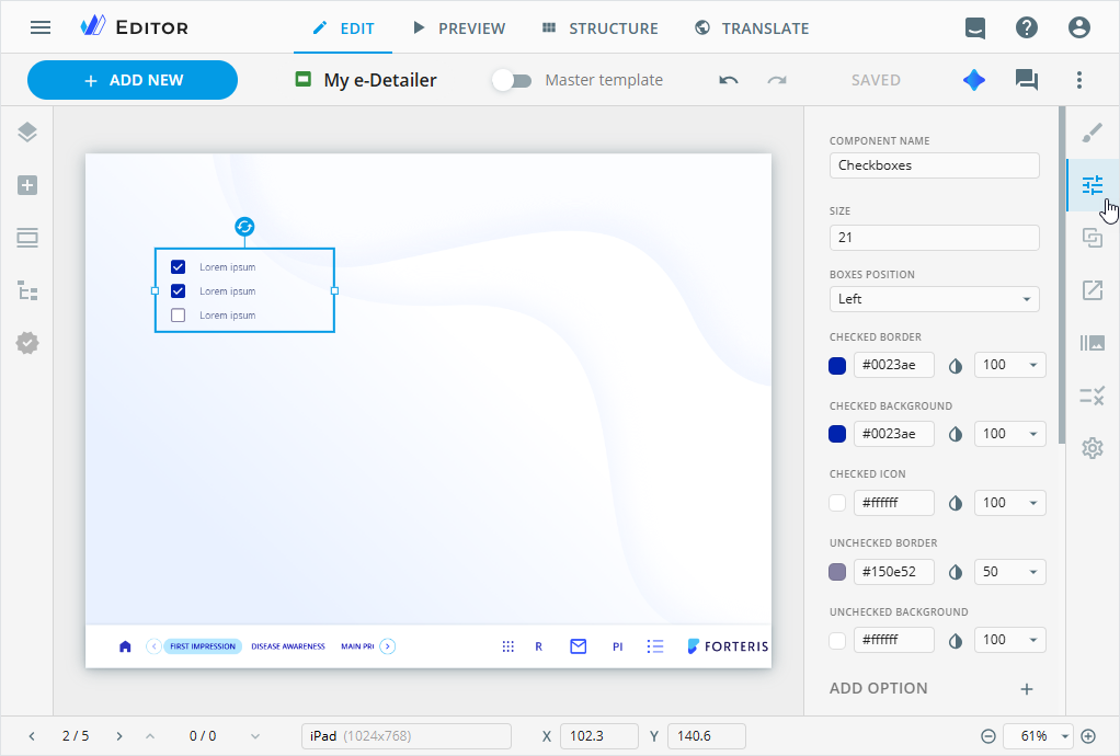 To add this component to your e-Detailer, drag CHECKBOXES from the Components tab on the elements panel to the e-Detailer layout.