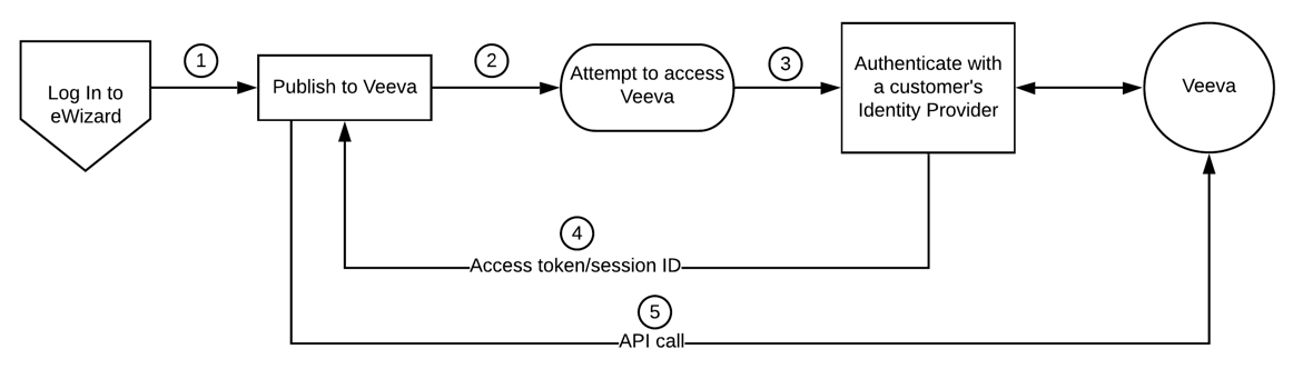 A user logs in to eWizard. To publish items to Veeva Vault PromoMats or to use assets from Veeva Vault PromoMats, they need to access Veeva Vault PromoMats. For this, the authentication/authorization is required, that's set up using the customer IdP. The user passes the identity check, receives the Veeva Vault session ID token, and is allowed to access resources from Veeva Vault PromoMats.