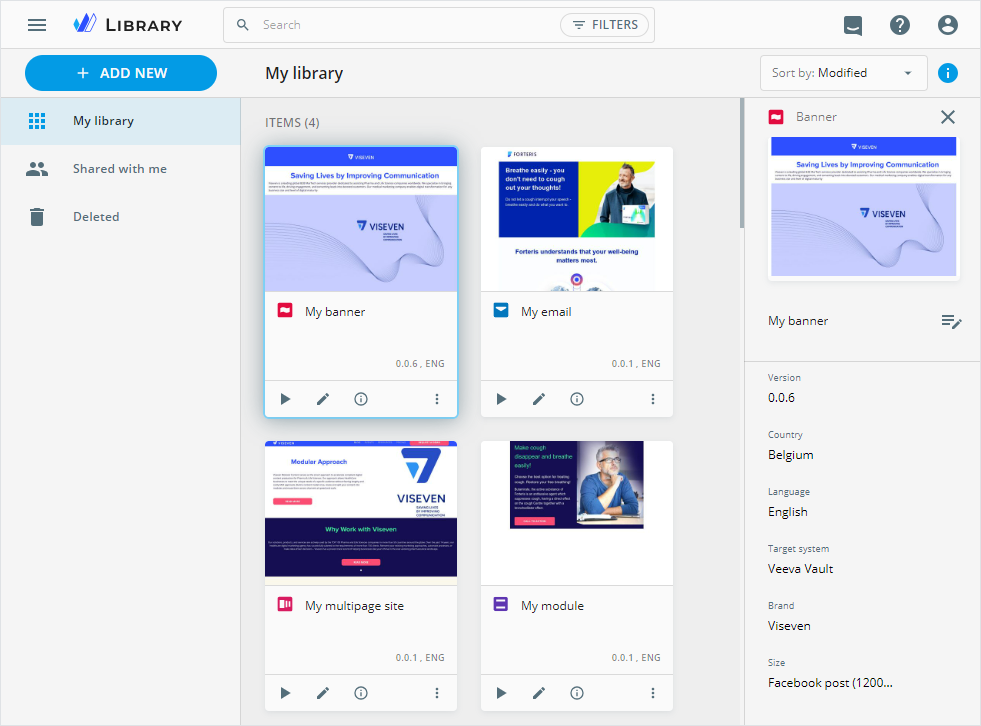 Blockstab and move it to the banner layout, manually customize its components, or pull assets from Veeva Vault PromoMats.Pull ready-to-use content modules directly from Veeva Vault PromoMats and internal eWizard storage, streamlining content creation. For this, use the Assets popup or find the required content module on the