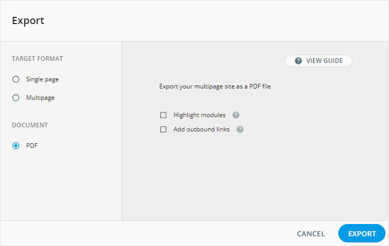 The following export options are available for multipage sites: