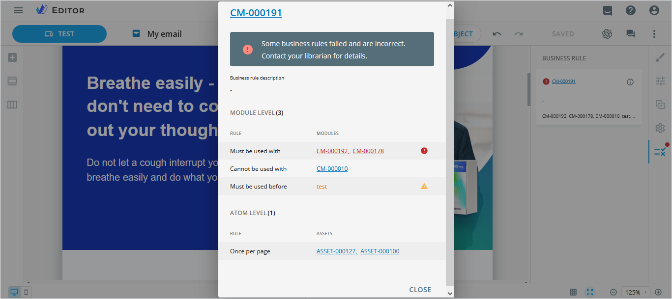 View the business rule details to check any violations on atom and module levels.
