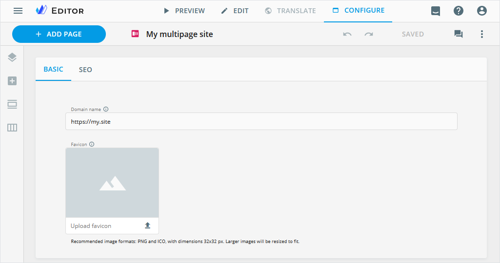 BASIC—to customize the domain name for the multipage site and add a favicon to streamline site recognition.SEO—to configure the meta title and description of the multipage site for search engine visibility and user engagement.